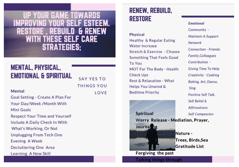 So, what shall we do about this… write things you like about yourself. At least 50. Then things you’re going to be great at. This time at least 60. Seems a big ask, but listen you need it. You are in charge of your self worth and self esteem. Self worth is what you feel about yourself, which in turn fuels your self esteem when you feel good, you develop more confidence and this leads to more self esteem. It’s an ever growing circle.